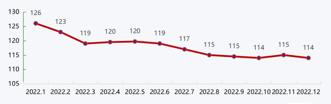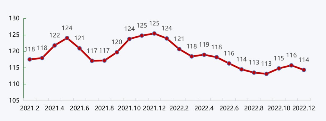 沿江城市砂石價格在年初高位運行的基礎上,受到疫情封港、下游需求不佳、沿江運費高企等因素的影響,價格持續回落,進入四季度,隨著施工旺季的到來,需求回升,價格也隨著略有回升。整體來看,2022年沿江港口砂石價格持續回落,12月降至114元/噸,較年初下降3.4%。